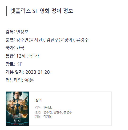 A: 물론이지! 오늘은 넷플릭스 코리아에서 감상할 수 있는 한국 SF 영화, 《정이 (JUNG_E, 2023)》를 소개할게.