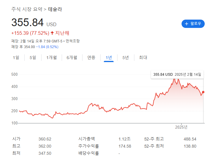 위의 차트는 2024년 2월부터 2025년 2월까지의 테슬라 주가 주간 변동을 보여줍니다. 2025년 2월 15일 기준, 테슬라의 주가는 355.84달러로, 전일 대비 0.06달러(-0.017%) 하락했습니다. 최근 5거래일 동안 하락세를 보였으며, 2월 12일에는 5거래일 연속 하락을 마감하고 2.4% 상승한 336.51달러로 마감했습니다.
