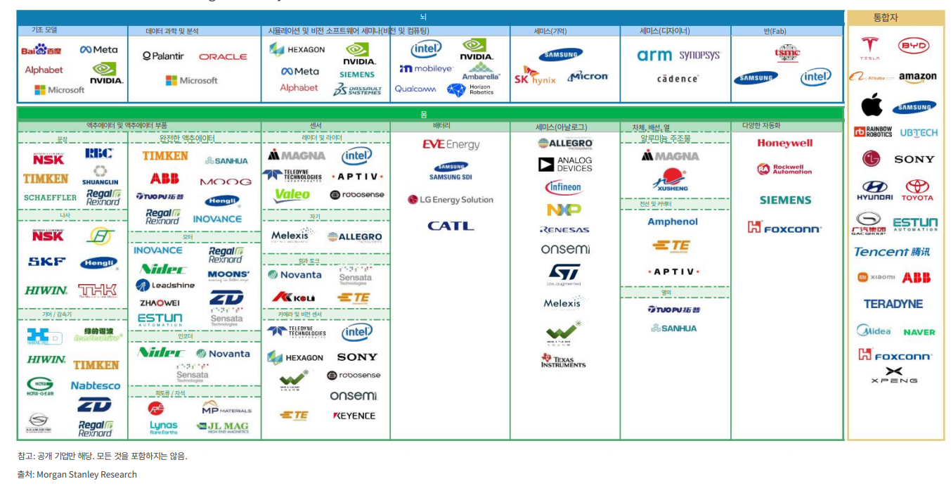 투자자는 각 영역별 특성과 기업의 경쟁력을 고려하여 전략적으로 투자 포트폴리오를 구성할 필요가 있습니다. 모건스탠리는 특히 AI 기술 구현 능력(두뇌), 하드웨어 제조 역량(몸), 그리고 시장 진입 및 통합 역량을 가진 통합자 기업들을 중심으로 투자를 고려할 것을 권장하고 있습니다.