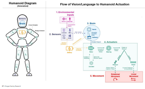 모건스탠리는 휴머노이드 로봇의 가치 사슬을 크게 세 가지 영역으로 구분하여 분석했습니다.